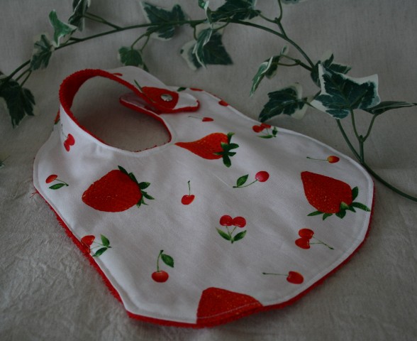 いちご柄の布があったので何を作ろうかすっごく悩んで 思いついたのがこれ! スタイです! バネホックを使ったので、これまたいい感じ!